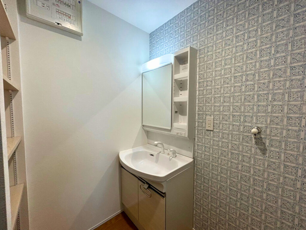 洗濯動線がスムーズになる洗面脱衣室には、収納力のある可動棚を設けており、タオルや日用品をすっきり整理できます。