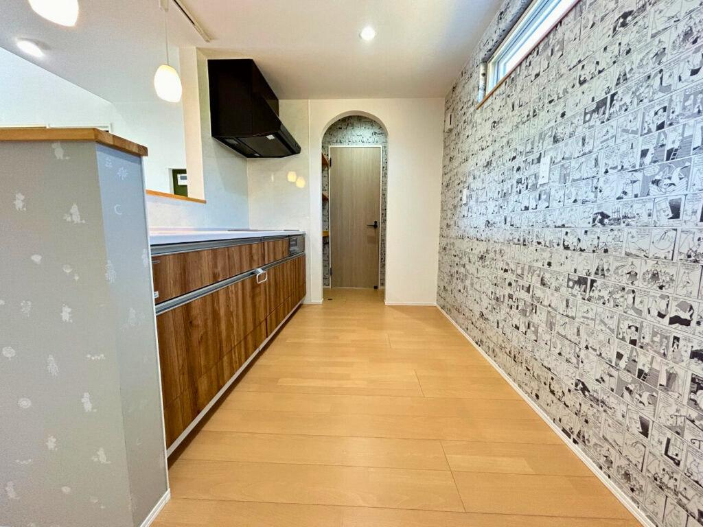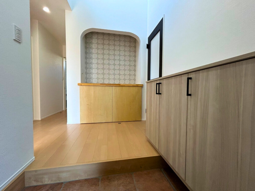 アーチ壁の造作棚を設け、やわらかな曲線とアクセントクロスがデザイン性をプラス。