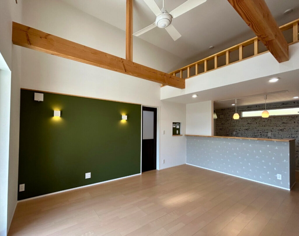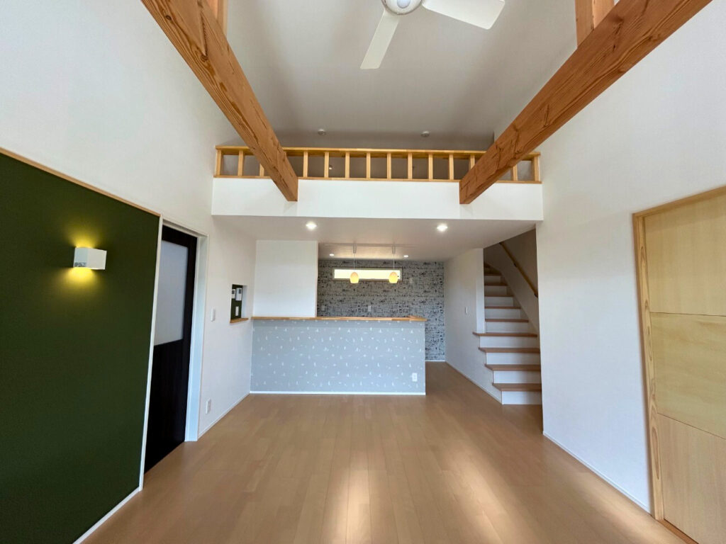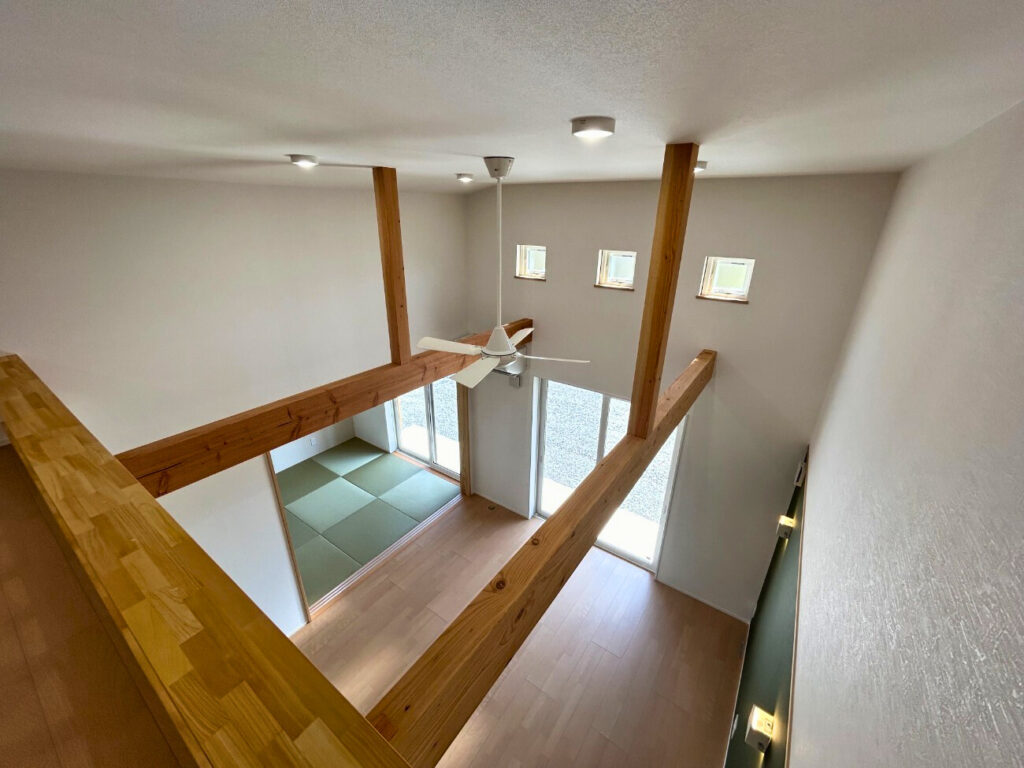 ロフトからはリビング全体を見渡すことができ、開放感のある眺めが広がります。