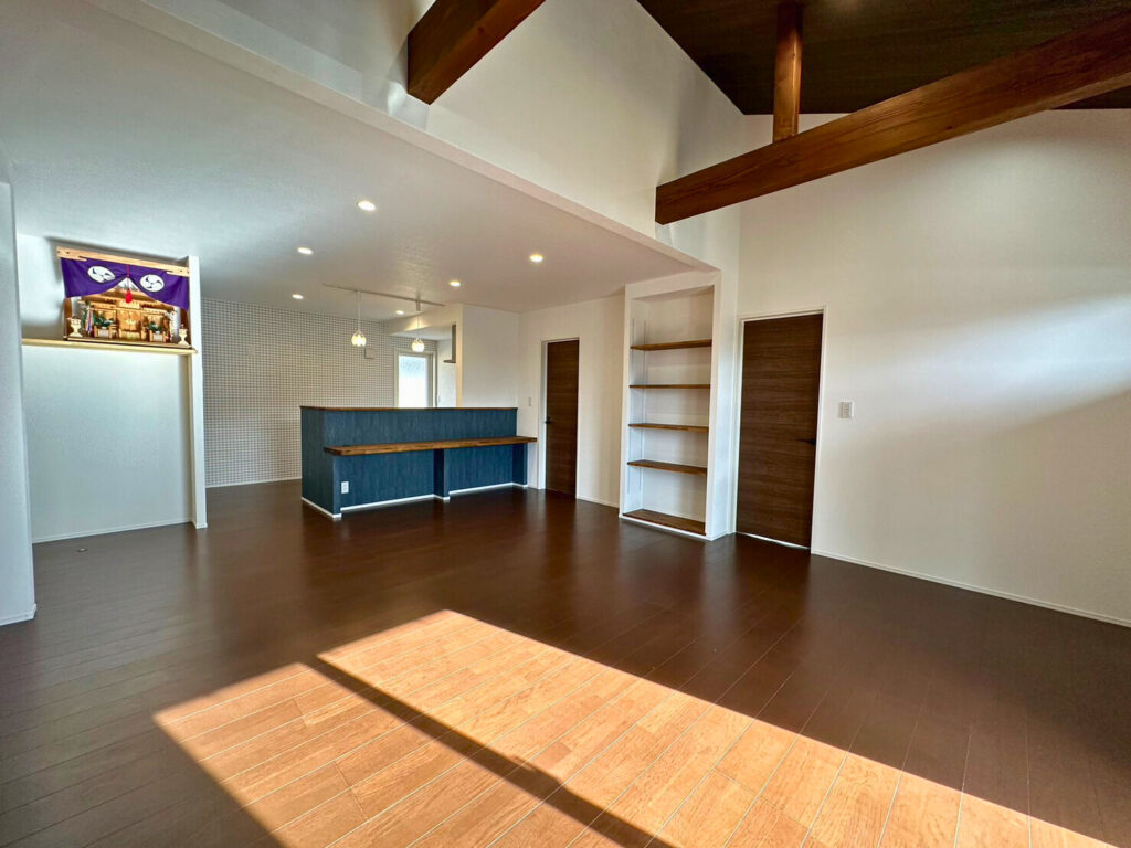 木の梁や床の色味が空間にあたたかさを添え、落ち着いた時間を過ごせるLDKです。