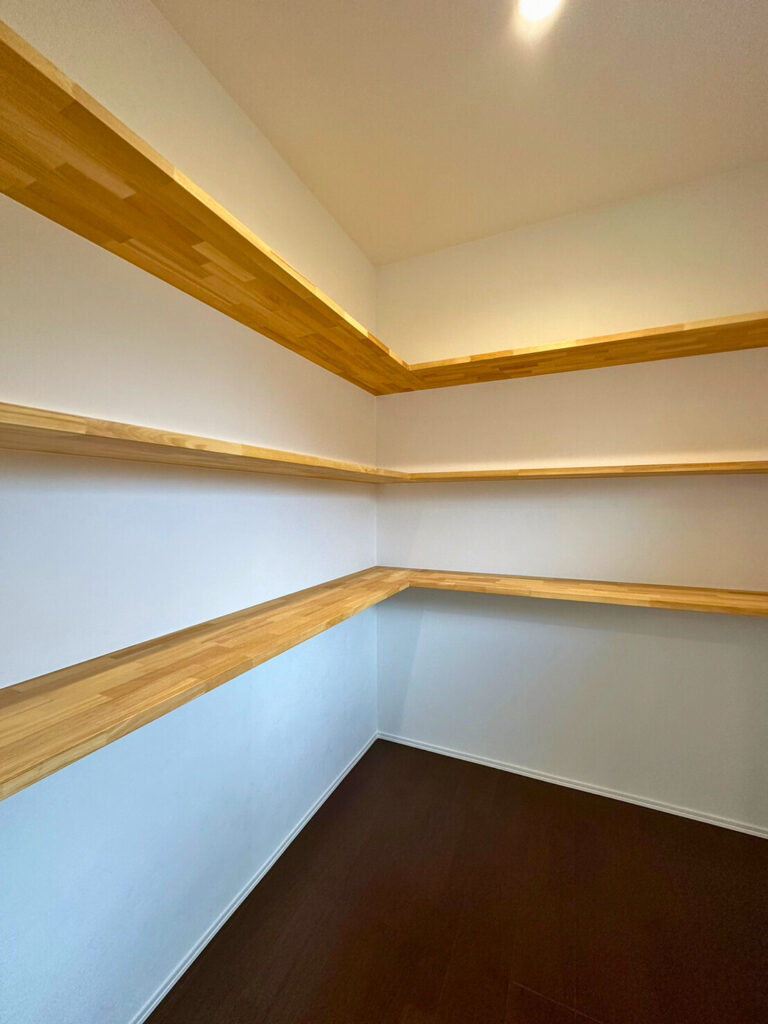 すぐ隣には広いパントリーを備え、食材や日用品をまとめて収納できるため、キッチンまわりをすっきり保つことができます。
