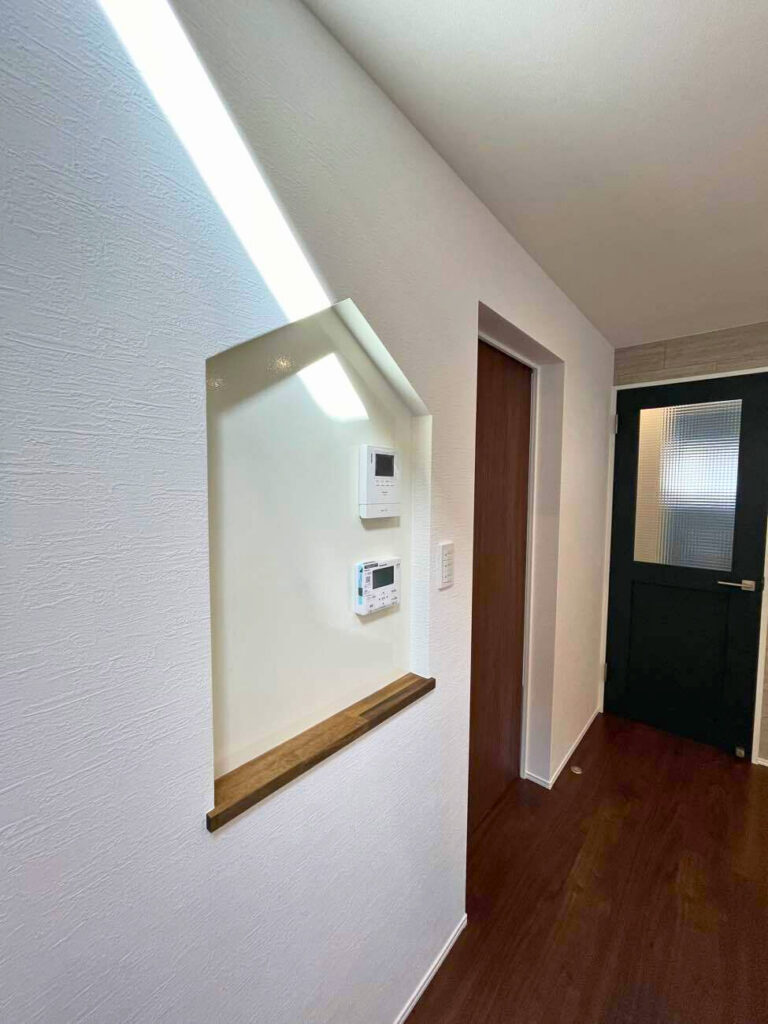 リビングの壁面に設けたニッチは、インターホンや給湯リモコンをまとめて配置。