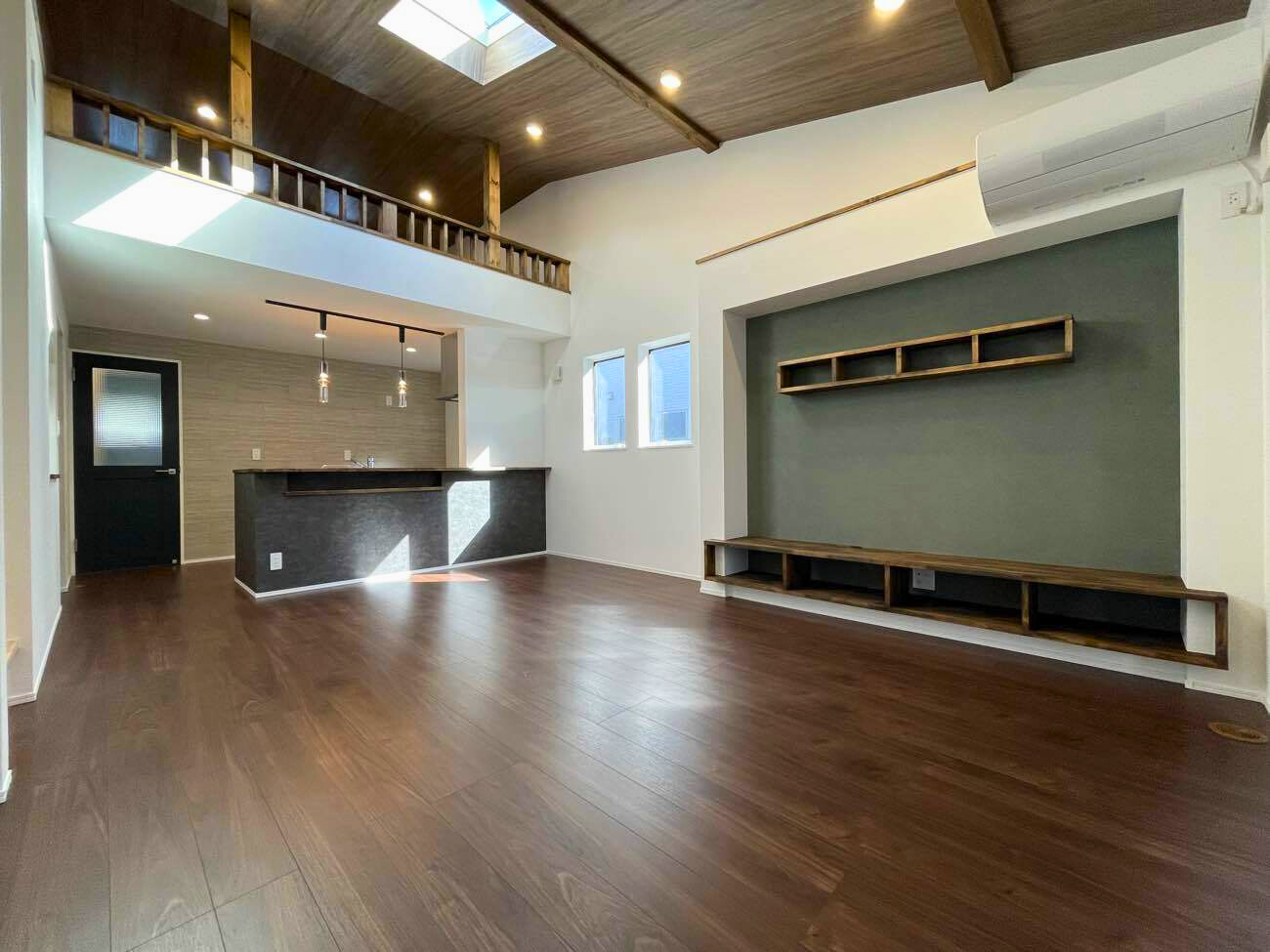 化粧梁や木の質感に加え、テレビまわりをすっきり見せる造作棚を設け、インダストリアルな雰囲気の中にも心地よさを感じられるLDKです。