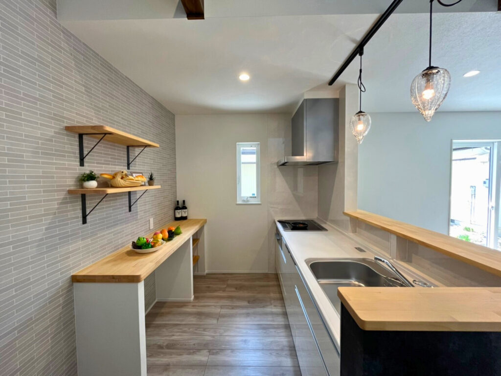背面にはカウンターと棚を設け、調理や配膳、ちょっとした家事もスムーズに。