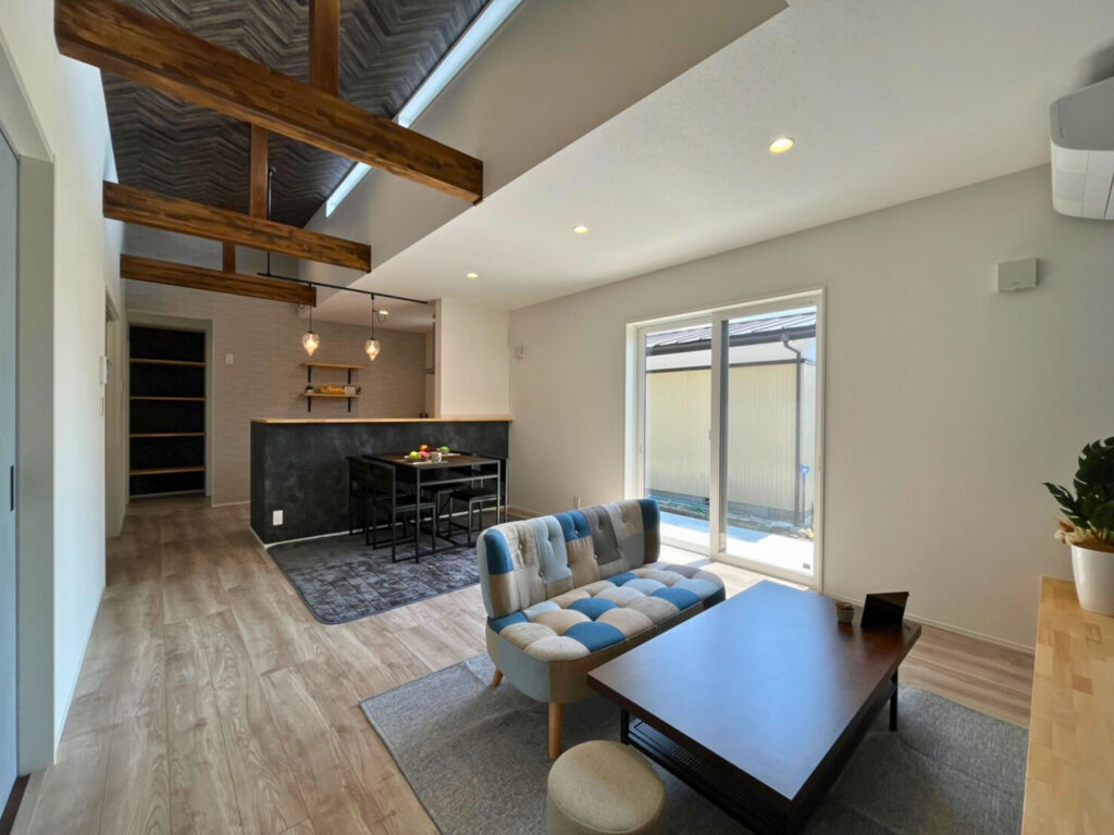 斜め天井とあらわし梁が印象的で開放感と暮らしやすさを両立した、住まいの中心となるLDKです。