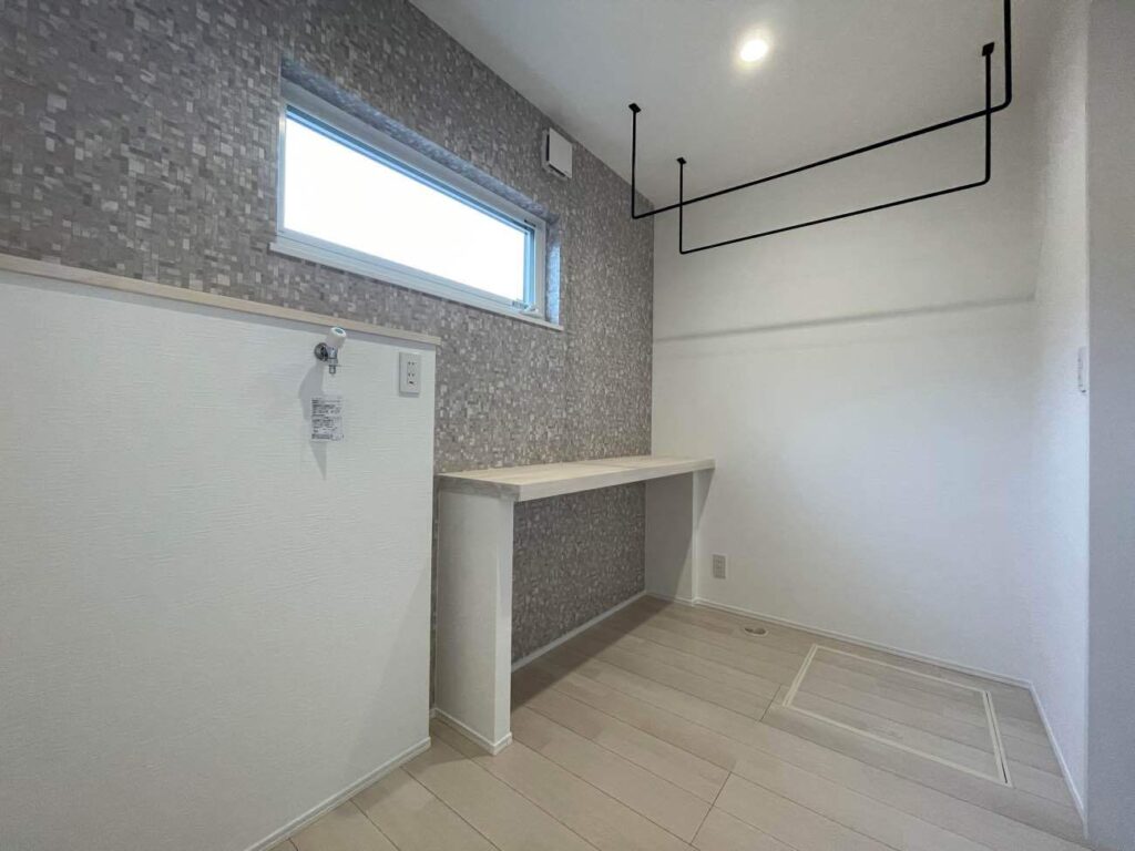 造作テーブルを設け、洗う・干す・たたむが一か所で完結。
