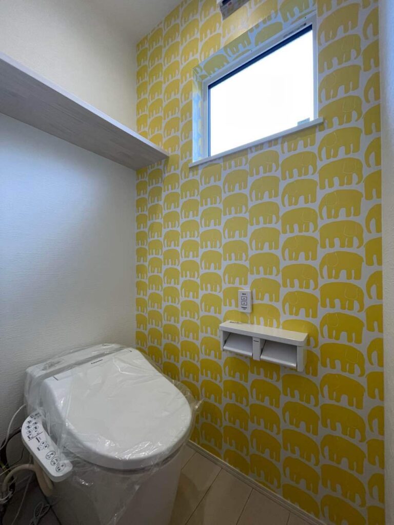 おしゃれな洗面台に加え、アクセントクロスを取り入れたトイレ空間。